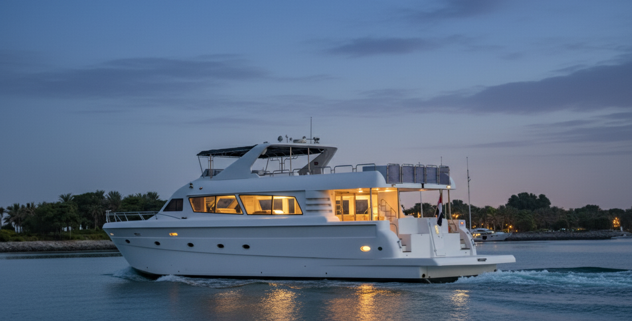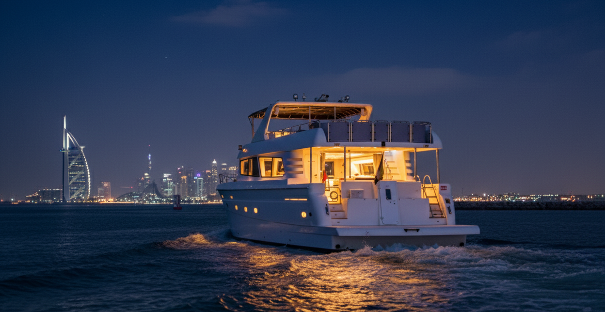 Enjoy a scenic shared yacht cruise from Dubai Marina with breakfast or BBQ, featuring stunning views, onboard dining, and a relaxing luxury experience.